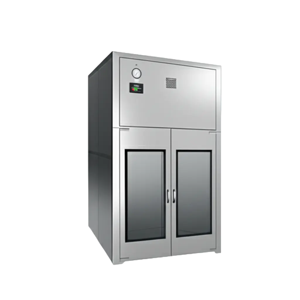 The passbox is equipped with a recirculatory air system, maintaining a positive pressure environment. A certain percentage of fresh air intake enhances efficiency and cleanliness.